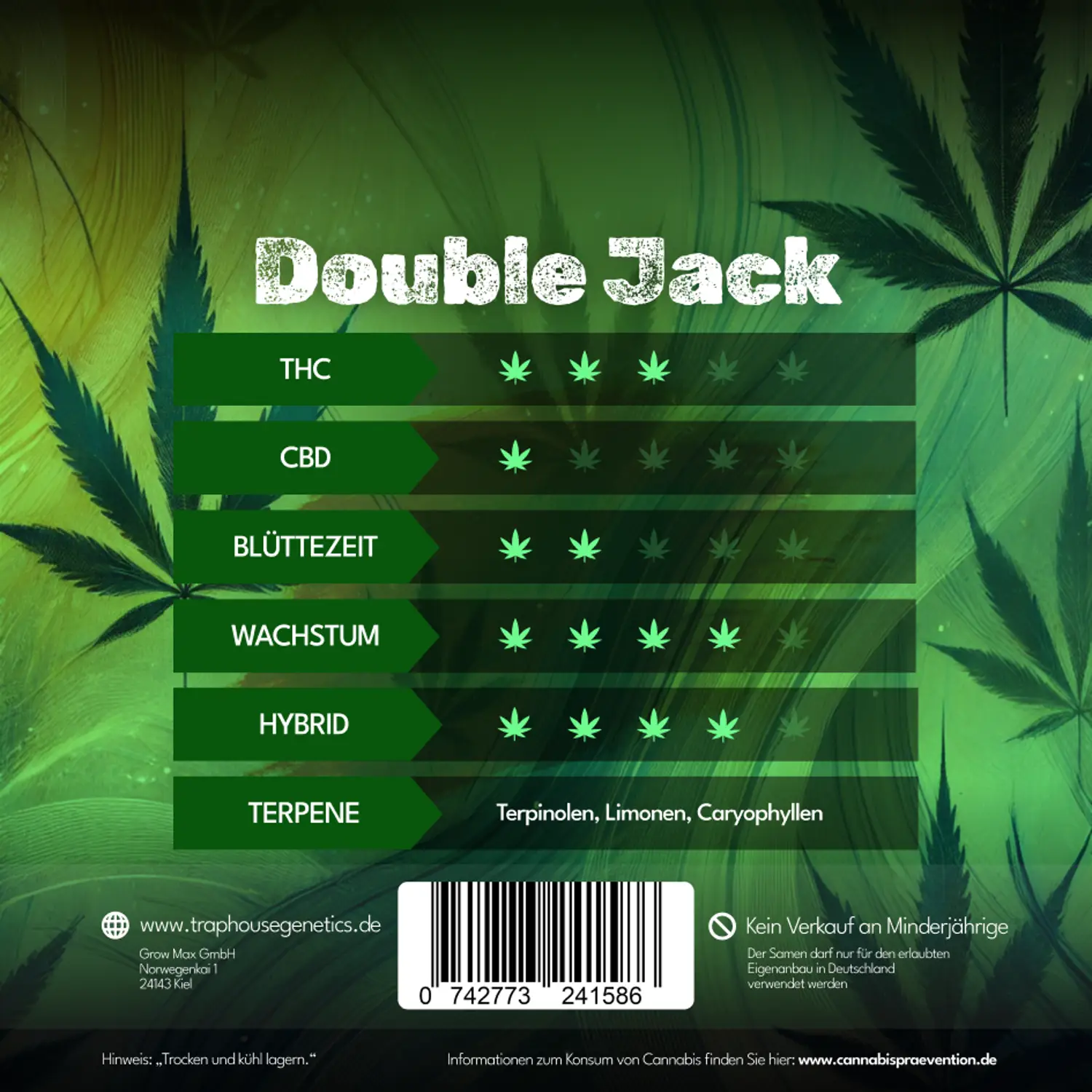 Zwei Haze-Klassiker – Jack Herer und Jack Flash – verdichtet zu einer Fast-Version mit Energie, Druck und klarer Linie. Double Jack Fast bringt dir alles, was du an Sativas liebst: Wachheit, Kreativität, Fokus – nur eben früher. Keine halben Sachen, kein ewiges Warten. Traphouse Approved.